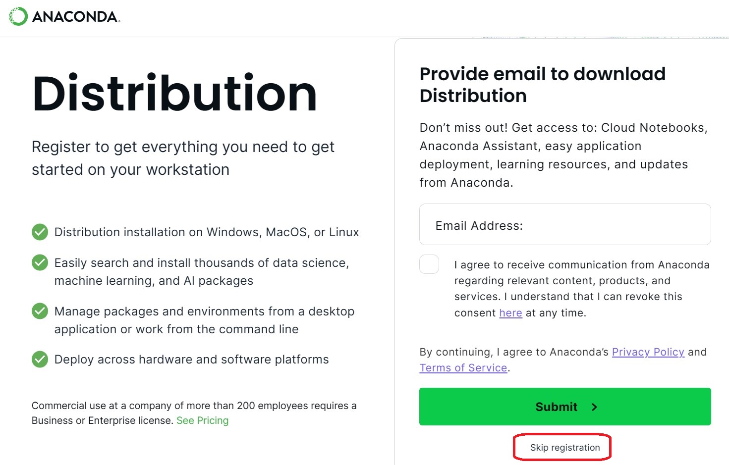このページには、Provide email to download DistributionとしてEmail Addressを記入する欄があります。記入すれば様々な情報が提供されると記載されていますので、記載していただいてもよいと思いますが、Skip registration(赤枠の位置)をクリックして、上に記した「Download Now」ページ(https://www.anaconda.com/download/success)に直接進むことも可能なようです。